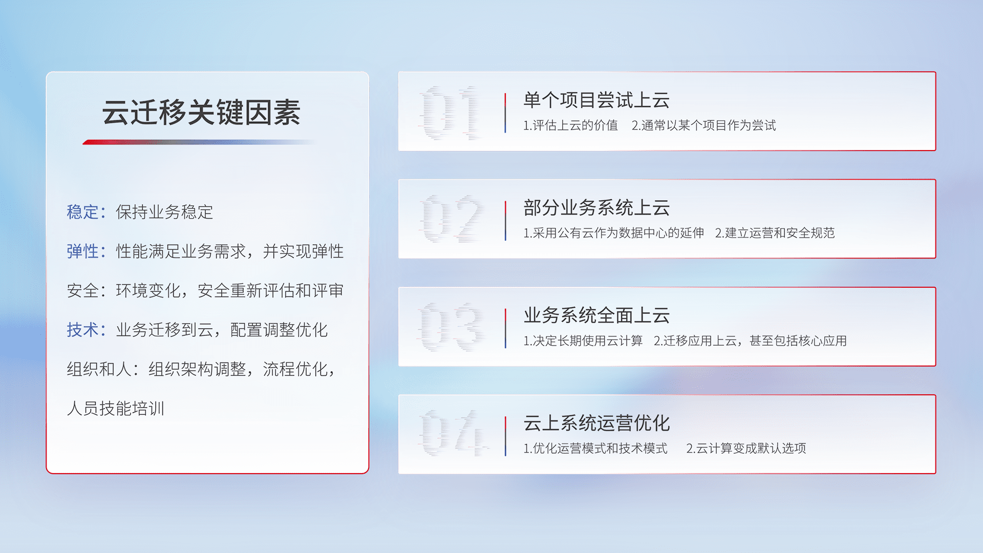 结合实际业务,,从规划设计、、、云平台选型、、、云原生改造、、、、数据迁移、、、集成交付,,,,迁移全过程为客户识别最佳上云路径,,,,做好风险识别管理,,,,设计网络架构、、、、身份权限、、、安全审计合规、、操作审计、、日志审计、、、、监控告警策略、、多站点容灾设计等,,,对云上基础设施进行整体规划,,,提升IT治理水平,,,以满足弹性、、、、高可用、、高性能的需求。。。