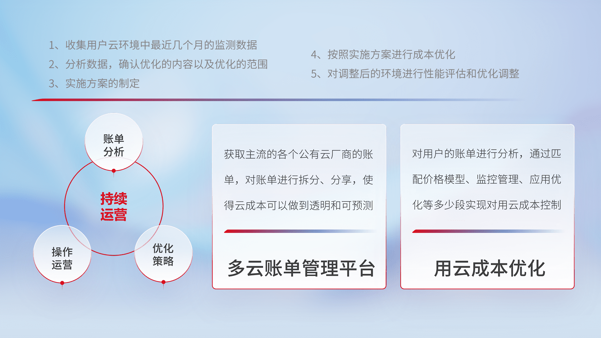 通过多云纳管,,,以统一的资源数据模型把客户的云资源进行抽象和封装,,进而实现对多云资源的统一操作,,,保障云资源管理的可靠性、、、、稳定性与可用性。。。量身定制化运维内容,,配置、、、、开发运维、、补丁管理、、、备份、、、监控、、、认证和访问管理、、、审计和日常巡检等,,保障在用云过程中的可靠度,,稳定度以及高可用率。。。。